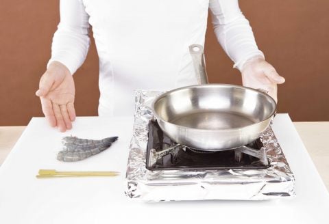 - Sur votre plan de travail, disposez les gambas, les piques en bambou et une casserole.