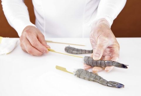 - Plantez une pique dans le dos de chaque gambas pour les redresser : elles doivent être bien droites.