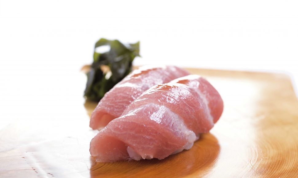 Avec la fine lame d’un couteau bien affûté et humidifié, coupez le thon de biais en 10 fines tranches d’environ 25 g chacune, de gauche à droite.