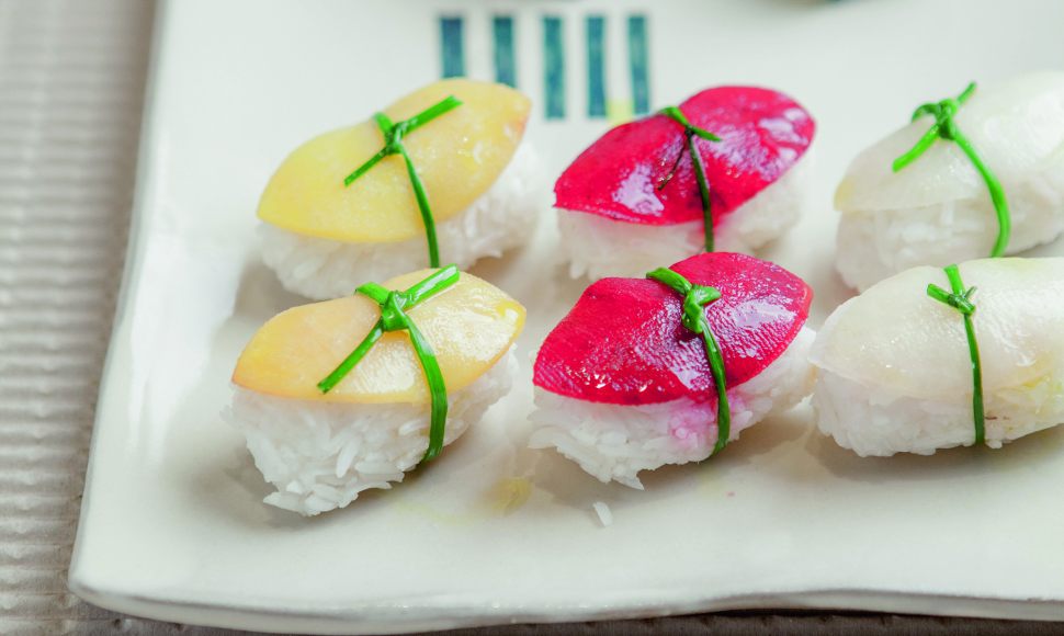 Rincez et séchez la ciboulette. Prenez une petite poignée de riz et, dans la paume de vos mains, formez-la en sushi. Déposez dessus une lamelle de légume mariné, puis enroulez autour une tige de ciboulette et nouez-la. Déposez le sushi sur le plat de service. Continuez ainsi jusqu’à ce que vous ayez épuisé le riz.