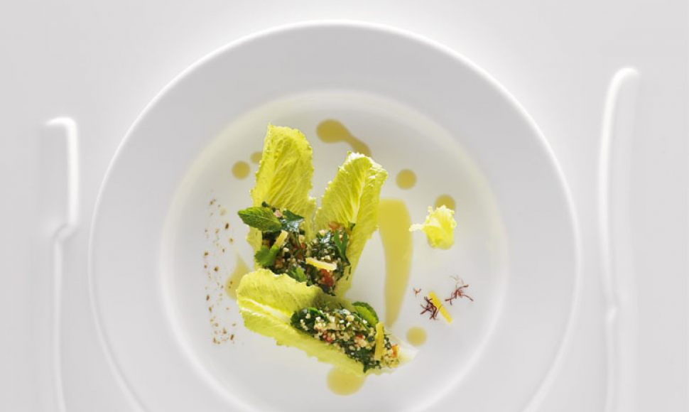 Le taboulé marocain se différencie par la saveur apportée par le safran. Nous l’avons présenté dans de petites feuilles de romaine de façon à ce que l’on puisse le déguster ainsi, d’une bouchée.