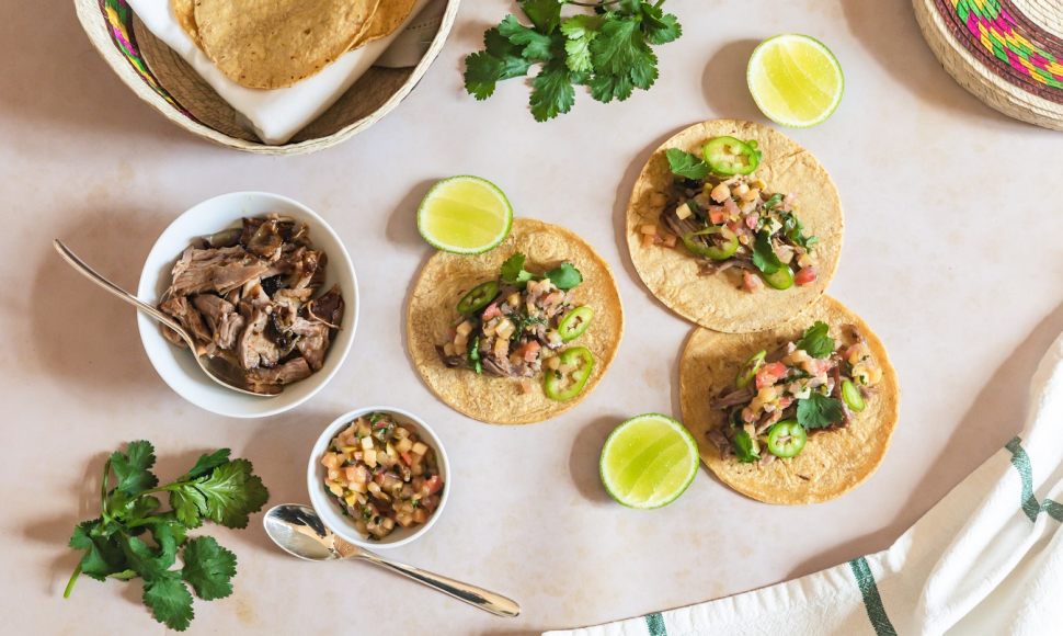 Une fois que l’échine est confite, ajouter un demi-verre d’eau pour détendre un peu le jus de cuisson et effilocher le cochon.
