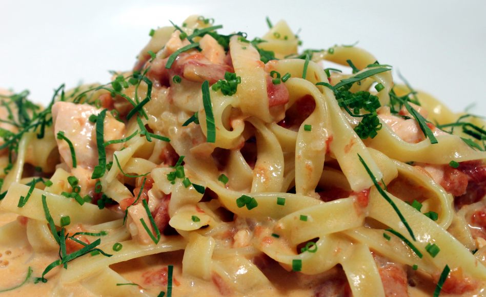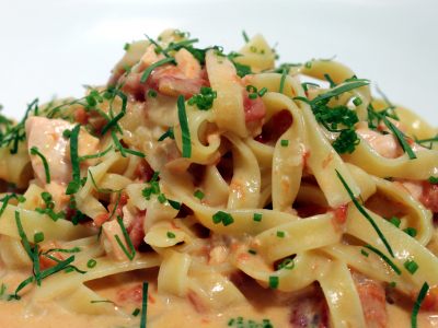 Les tagliatelles... Ces longues pâtes typiquement italiennes, sont cuites "al dente" dans une recette savoureuse aux dés de saumons frais. Une fois dressées dans l'assiette, il suffit d'ajouter du persil et de la ciboulette fraîchement ciselée pour sublimer votre plat.