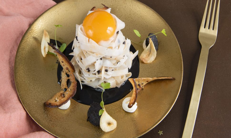 Tagliatelles de céleri rave, coulis de truffe noire et jaune d'oeuf coulant