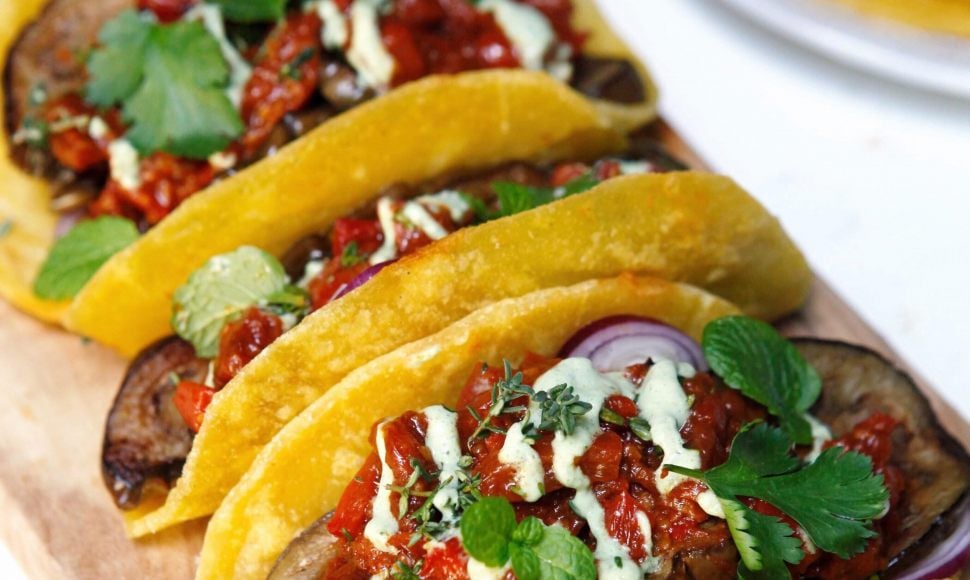 Tortillas de maïs garnies à l’aubergine grillée, compotée de poivrons et tomates