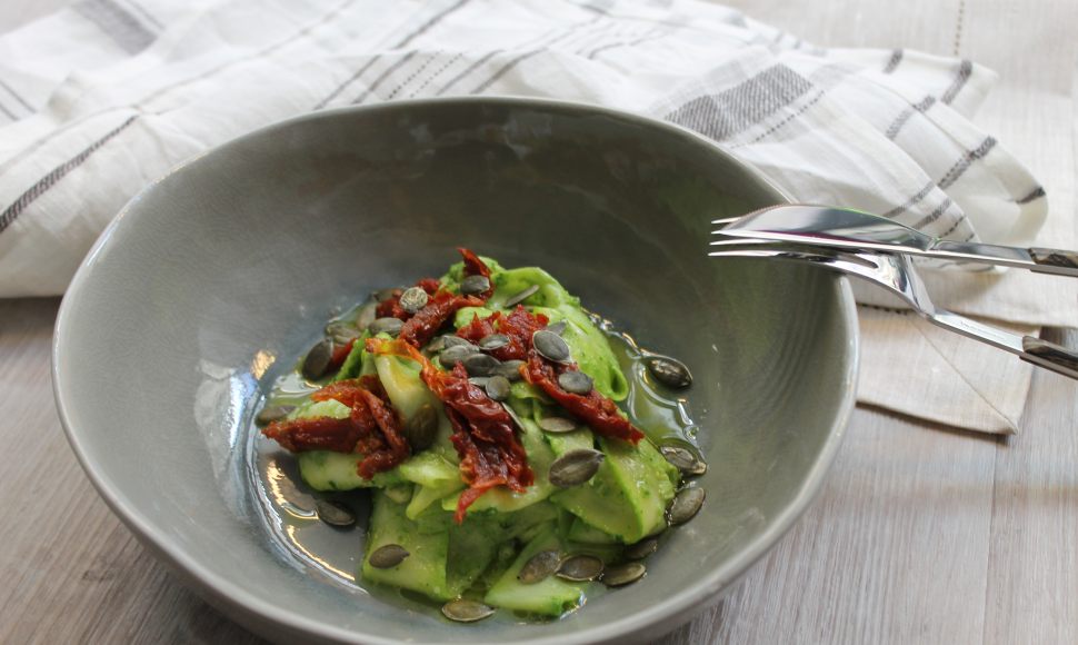 Réaliser des tagliatelles de courgettes à l’aide d’un économe. Faire chauffer un filet d’huile d’olive et faire sauter les courgettes. Verser le pesto, remuer puis ajouter les tomates confites. Dresser dans une assiette puis décorer de graines de courge.