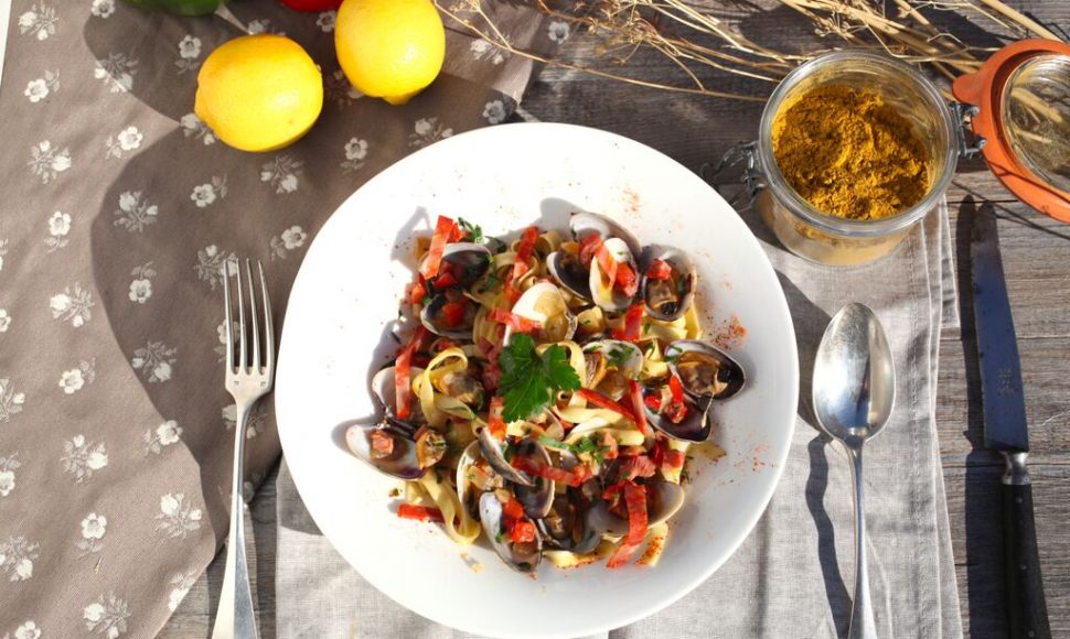 Faites chauffer une grande casserole d’eau salée pour les pâtes Nettoyez à grande eau les palourdes avec du gros sel , réitérer deux fois l'opération Coupez l’oignon et le poivron rouge en petits quartiers Ciselez le persil, hachez l’ail et coupez en cube le chorizo