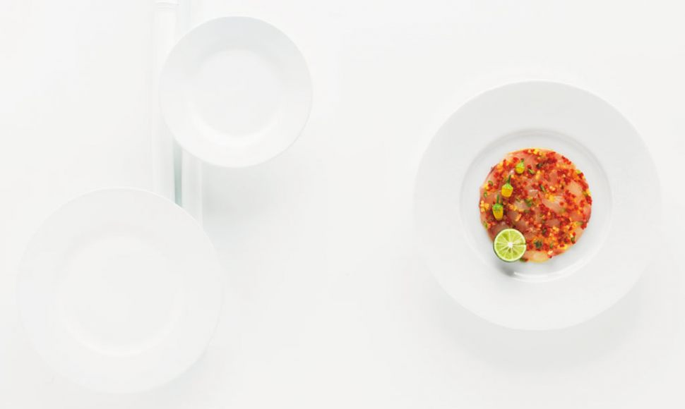 Taï en fines lamelles assaisonnées d’un mélange yuzu/miso/piments rouges/shiso/algues