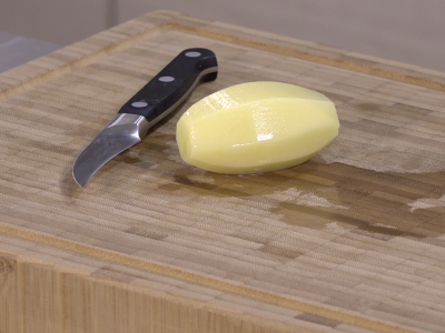 Tenir le couteau d’office de la main droite, placer le pouce droit sous la pomme de terre. Tirer le couteau d’office vers le bas en réalisant une incision en rotation du poignet afin de tailler la première facette. Pivoter d’1 cm la pomme de terre sur son axe, et réitérer l’opération afin de créer la 2e facette, poursuivre ensuite cette opération 5 fois de plus afin d’obtenir une pomme de terre « tournée » comprenant 7 facettes au total.