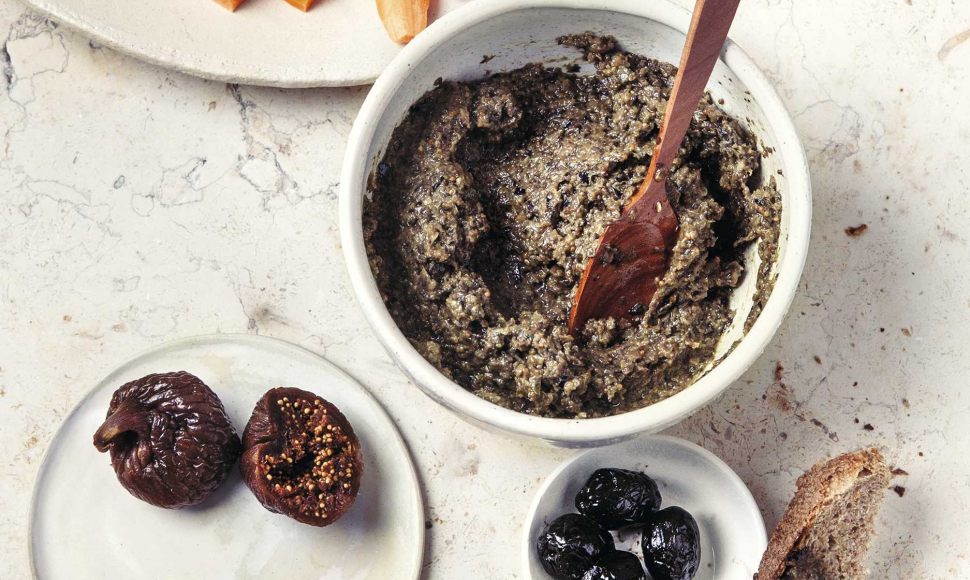 Mixez les olives, les figues, les câpres, l’ail et la poudre magique en ajoutant le jus du citron, puis l’huile d’olive peu à peu. La purée doit être légèrement granuleuse.