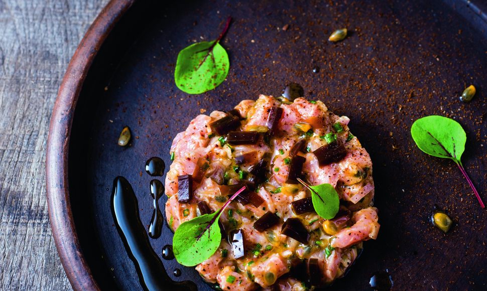 Un tartare de veau savoureux coupé au couteau associé à la saveur intense du café et au fruit de la passion.