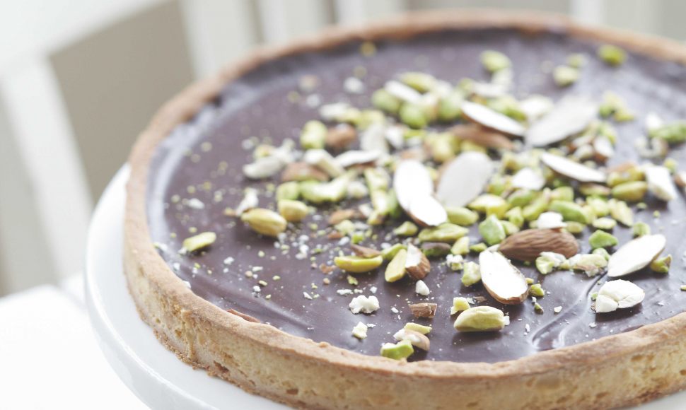 Préparez alors la ganache : coupez le chocolat en petits morceaux et faites-le fondre au bain-marie. Hors du feu, ajoutez la crème fleurette tiédie et mélangez délicatement au fouet afin de ne pas incorporer d’air. Garnissez le fond de tarte de ganache et laissez prendre à température ambiante. Décorez avec les fruits secs.