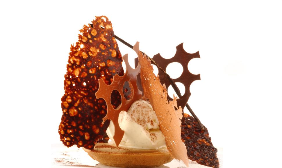 Démouler la tartelette sur une assiette plate. Déposer un disque de crème brûlée dans la tartelette. Y déposer une quenelle de glace vanille. Piquer celle-ci de crème pâtissière séchée, de dentelles de chocolat et de tuiles au chocolat au lait. Poudrer de cacao.