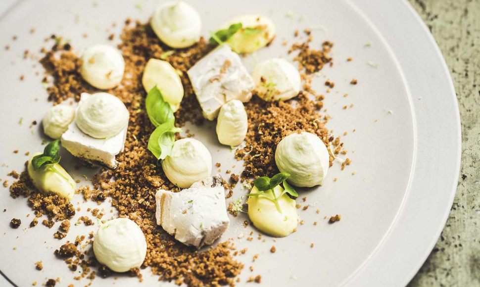 Une tarte au citron déstructurée à l'espuma de citron vert, meringue et crumble à l'huile d'olive.