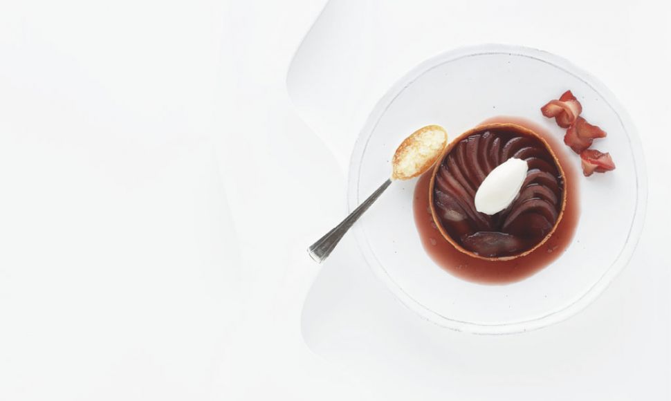 Tarte au vin et aux poires, granité de vino santo et sorbet amande