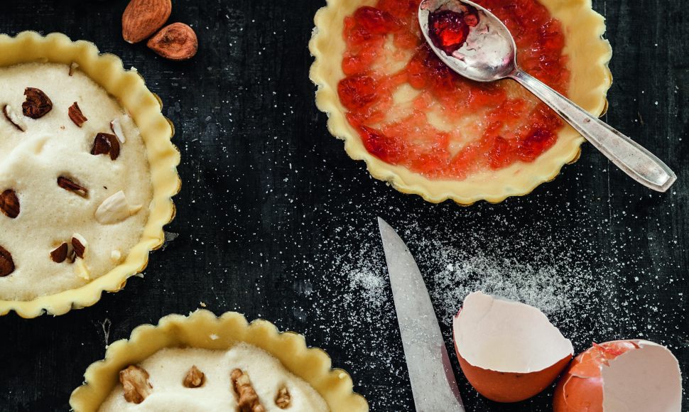 Préchauffez le four à 210 °C (th. 7), en chaleur sole uniquement et avec ventilation. Étalez la confiture de fruits rouges ou la gelée de groseille sur la surface de la pâte. Hachez les noix grossièrement. Séparez le blanc des jaunes. Fouettez les jaunes avec le sucre, puis montez les blancs en neige. Mélangez le tout et versez sur le fond de tarte. Enfournez et faites cuire 30 min.