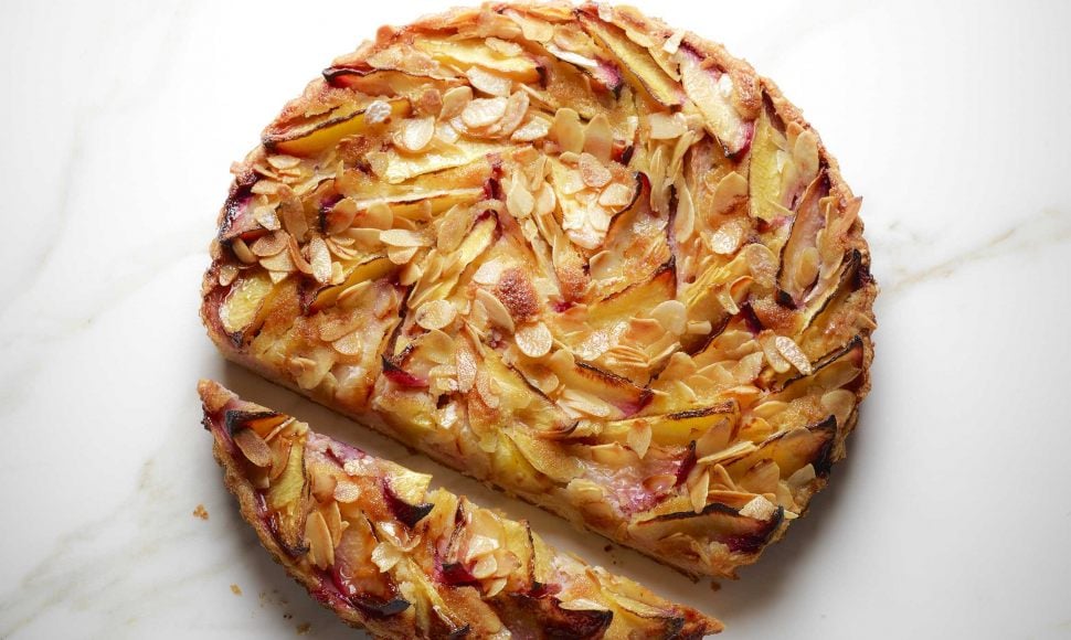 Une tarte gourmande et simple à réaliser à la maison : quelques pêches jaunes, quelques pêches blanches, des amandes effilées et un peu de dextérité. Hop, au four !