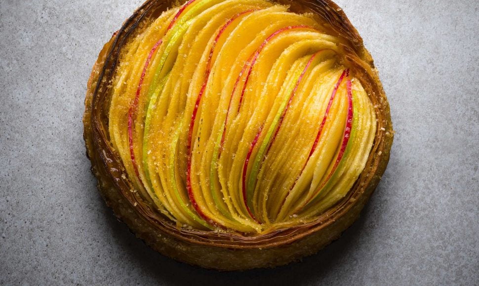 Revisitée par Cédric Grolet, meilleur pâtissier du monde, cette tarte aux pommes à l'ancienne sublime le classique français grâce à une base de brioche feuilletée maison, une généreuse crème d'amande et une compotée de pommes relevée au citron.