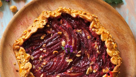 Repliez les bords de la pâte sur les fruits. Badigeonnez les bords de la pâte avec le jaune d'œuf. Saupoudrez également de noisettes hachées.