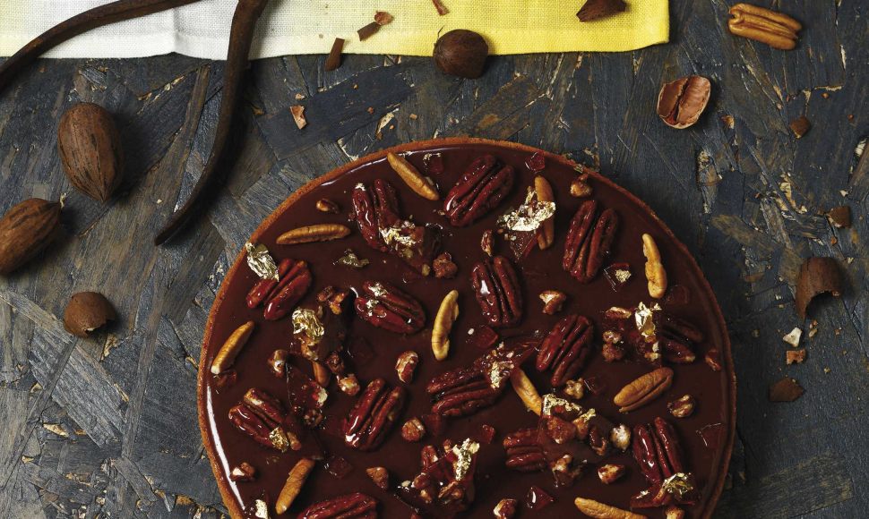 Une tarte fondante à la crème de pécan, recouverte d'un glaçage chocolat-praliné et de noix de pécan caramélisées.