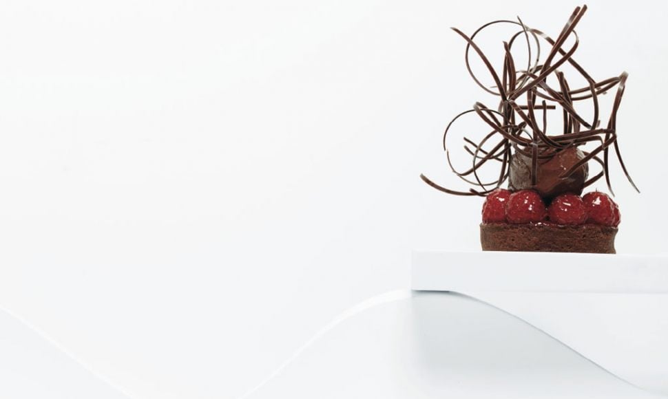 Tarte choco/framboise, sorbet au chocolat fort et jus de fruits rouges
