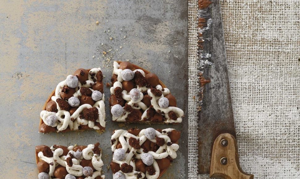 Une tarte à la pâte croquante, surmontée d'une ganache montée onctueuse chocolat noir-vanille et chocolat blanc-vanille, agrémentée de streusel cacao et de noisettes enrobées.