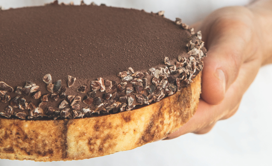 Attention, pour cette recette, il convient de faire cuire la crème d'amande au grué de cacao sur le fond de tarte encore tiède et de prolonger ensuite la cuisson 12 minutes.