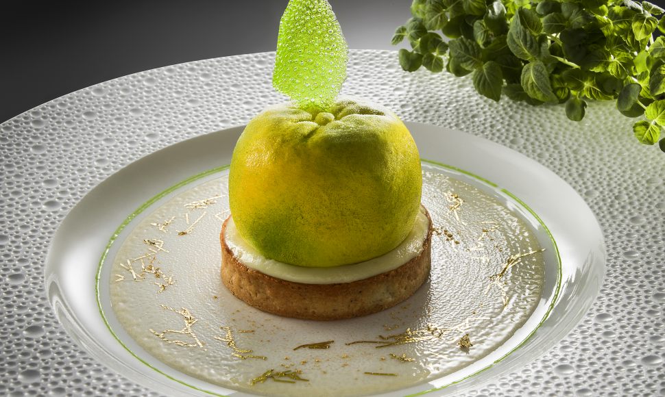 Hacher le citron confit et les suprêmes de citron de Menton au couteau. Ajouter le jus de yuzu mélangé au xantana. Mouler en demi-sphère et mettre au congélateur. Après congélation, démouler les demi-sphères et réserver au congélateur.