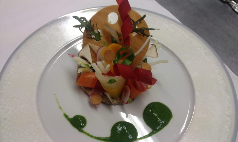 Nettoyer et éplucher tous les légumes. Les tailler en rubans de 2 mm d’épaisseur. Les cuire séparément, et à couvert, dans un sautoir chauffé avec un filet d’huile en leur ajoutant 1 gousse d’ail et en les gardant croquants. Les réserver.