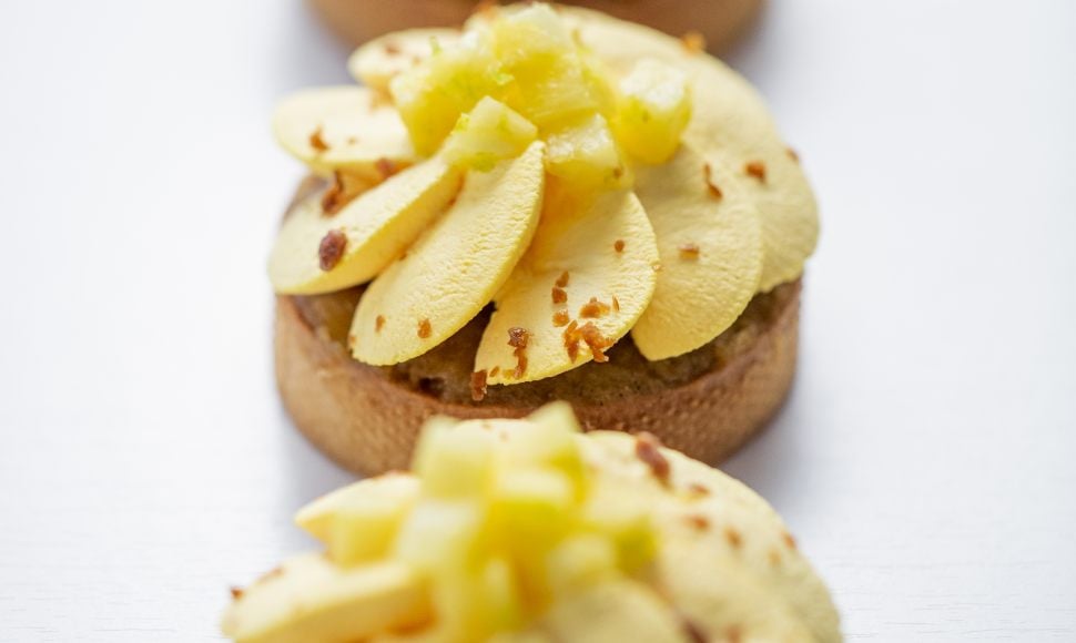 Sur un biscuit de coco et sous une chantilly exotique élégamment dressée, c'est l'abondance de l'ananas frais qui fait de cette tartelette une bulle de fraîcheur.