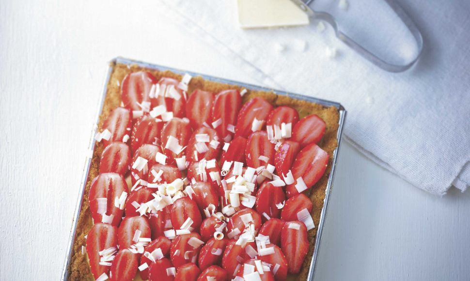Une tarte aux fraises avec une délicieuse crème au chocolat blanc, mascarpone et à la crème d'amande, un pur délice !