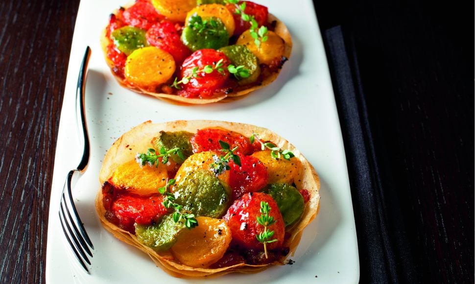 À l’aide d’un épluche-tomate, pelez les tomates et les poivrons. Coupez les tomates en quartiers puis épépinez-les. Coupez les poivrons en deux et épépinez-les. Découpez à l’aide d’un emporte-pièce rond de 3 cm 16 disques de poivron jaune, 16 de poivron vert et 16 de tomate. Coupez les chutes de légumes en petits morceaux. Dans une casserole d’eau bouillante salée, plongez les ronds de poivron pendant 1 min. Rafraîchissez-les dans de l’eau froide puis égouttez-les.