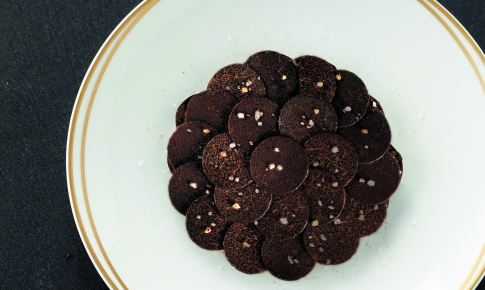 Brossez les truffes. Épluchez-les. Coupez-les en 84 lamelles de 1 mm d’épaisseur. Étalez-les sur des assiettes.