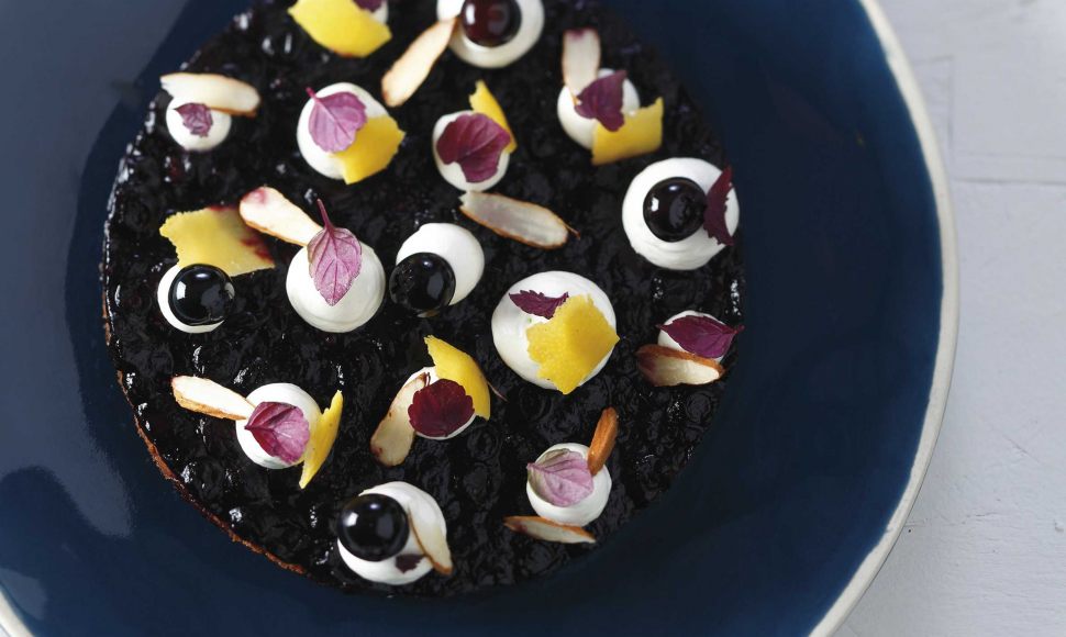 Une tarte à la myrtille, recouverte par des pointes de chantilly au citron et de ses zestes.