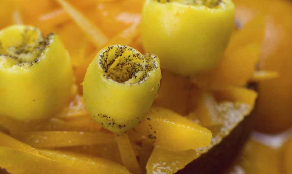 Le jour même au matin, faites bouillir le jus d’orange avec le sucre et l’eau, puis débarrassez dans un bac. Réservez 6 h au réfrigérateur. Turbinez. Une fois prêt, stockez le sorbet au congélateur jusqu’au dressage.