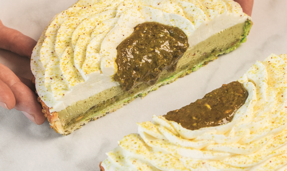 La spécificité de cette tarte ? Sa pâte sucrée marbrée et son pochage élégant. Ici, la pistache se marie à la fleur d'oranger, tout en puissance et en gourmandise. Pour cette recette, il faudra vous munir d'un moule à manqué de 16 cm de diamètre et d'une douille 104 (douille de pétale).