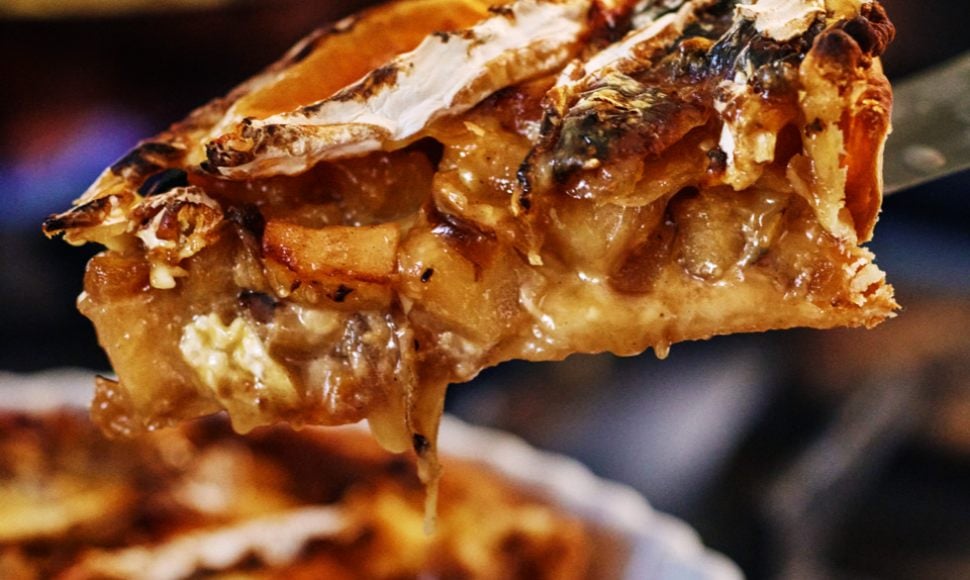 Déglacez avec le Calvados, et ajoutez le poivre. Garnissez le fond de tarte précuit avec cette préparation et décorez avec des belles lamelles de camembert. L'idée est qu'on les voie bien sur le dessus au moment où elles vont gratiner au four.
