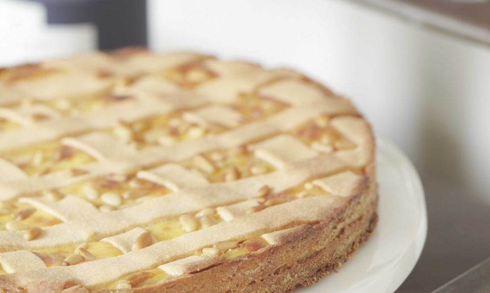 Une tarte à la ricotta fondante, parfumée à l'amande et agrémentée de pignons de pin.