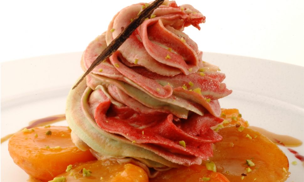 Tarte sablée d'abricots, compotée à la vanille, glace pistache, sorbet framboise et abricot