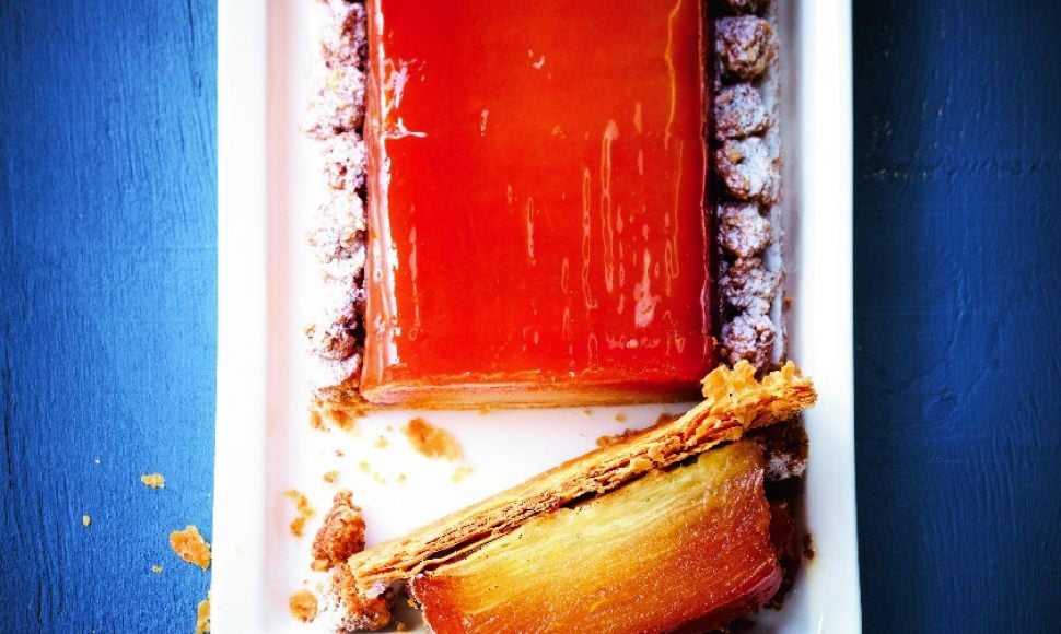 Pendant que le feuilletage est encore chaud, coupez 1 rectangle de 12 × 20 cm au couteau scie. Placez le moule à tatin au congélateur pendant 40 min pour donner une bonne tenue. Faites légèrement chauffer le moule au four à 150°C (th. 5) pendant 5/6 min, puis démoulez en plaquant un plat sur le moule et en retournant l’ensemble. Avec une palette large, déplacez ou faites glisser les pommes sur un rectangle de feuilletage caramélisé et légèrement plus grand sur les quatre côtés. Parsemez de streusel à la noisette sur le long des deux côtés des pommes.