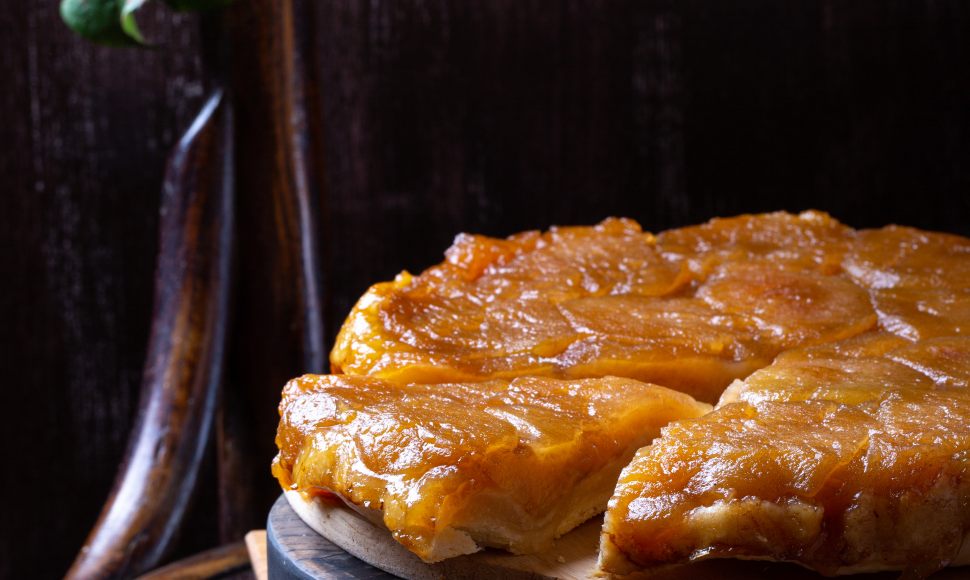 Éplucher les pommes et les couper en 4. Dans une cocotte en fonte de préférence, réaliser un caramel brun, décuire avec le beurre et disposer les pommes en rosace.