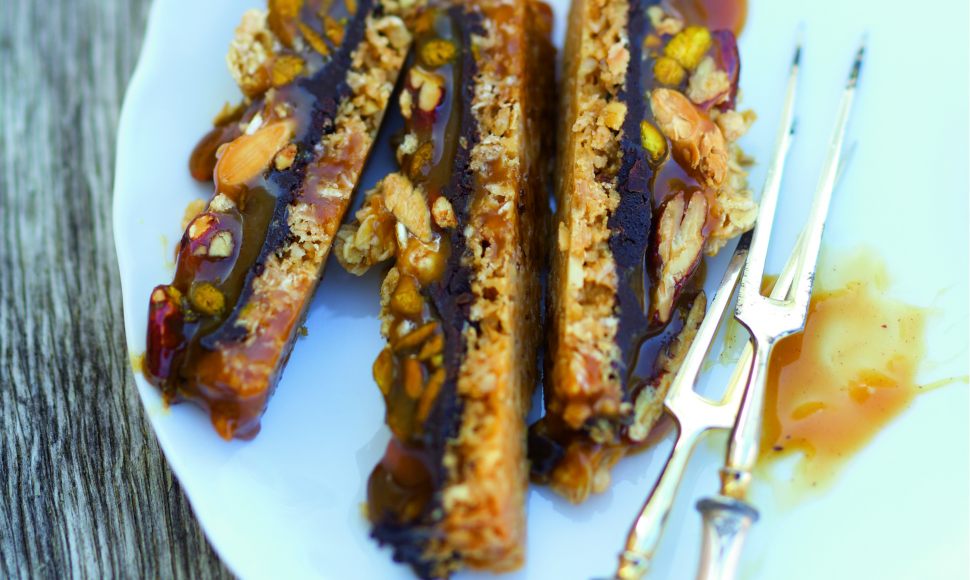 Tout est dans l'intitulé ! Fruits secs, céréales, banane, caramel, chocolat... j'ai tâché de n'oublier aucune des gourmandises régressives dans cette tarte vraiment trop irrésistible. La petite couche de chocolat noir amer fondu sur le fond de tarte permet de compenser la douceur du caramel. Mon pêché ? Mettre une part de cette tarte au congélateur et la manger encore glacée, comme un esquimau !
