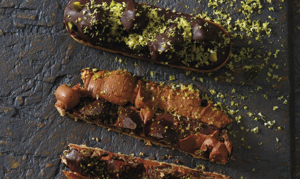 La veille, dans une casserole, faites bouillir 115 g de crème avec le glucose et le sucre inverti. Faites fondre le chocolat de couverture au bain-marie, puis versez la crème bouillante dessus. Fouettez jusqu’à l’obtention d’un mélange brillant. Ajoutez la crème restante bien froide et mixez. Mettez au réfrigérateur pour 24 h.