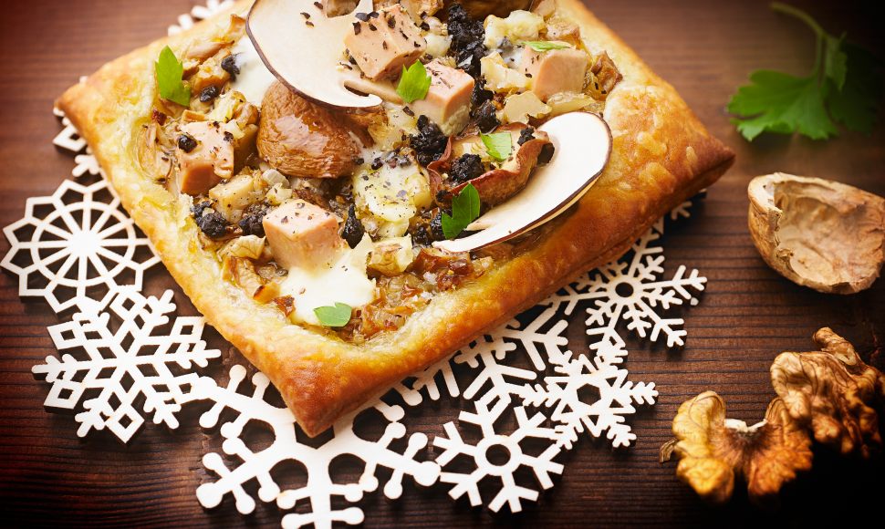 Ciseler l’échalote et hacher les cèpes. Dans une poêle, faire chauffer un filet d’huile et faire revenir l’échalote puis les champignons hachés. Assaisonner de sel et de poivre. Découper la pâte feuilletée en carrés et y déposer une partie de la duxelles de champignons.