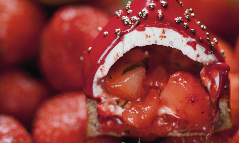 Une délicieuse tartelette à la fraise composée d'une ganache au basilic, d'une gelée et d'une compotée de fraises, ainsi que d'une crème d'amande-fraise.