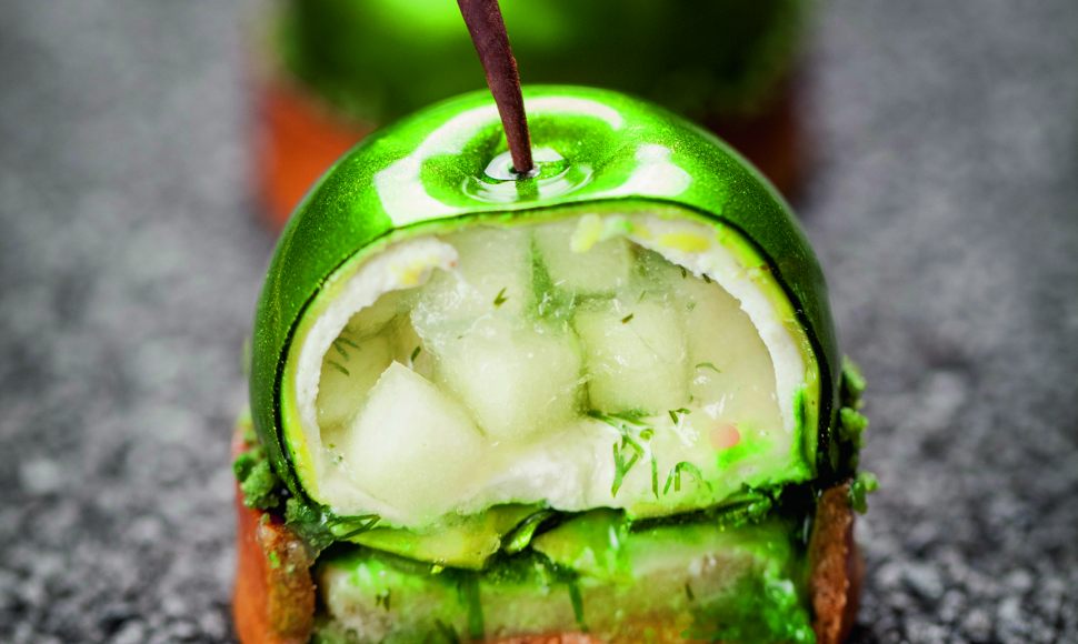 Toujours la veille, mettez la gélatine dans l’eau d’hydratation pour la faire gonfler. Faites chauffer 80 g de crème, versez sur le chocolat de couverture haché en émulsionnant, et ajoutez la gélatine. Mixez à l’aide d’un mixeur plongeant, ajoutez le reste de crème froide, le jus de pomme et la manzana, puis mixez à nouveau. Réservez 12 h au réfrigérateur.