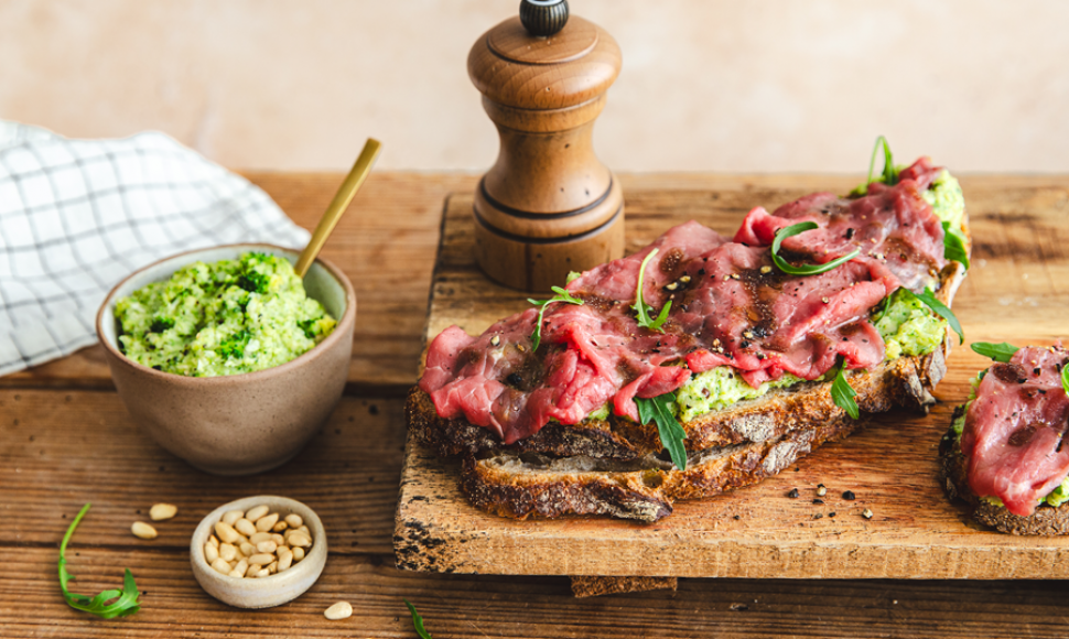 Le carpaccio de bœuf se déguste aussi bien seul que sur une tartine de pain frais au pesto de brocoli, comme dans cette recette de printemps, toute trouvée pour les tablées pascales.