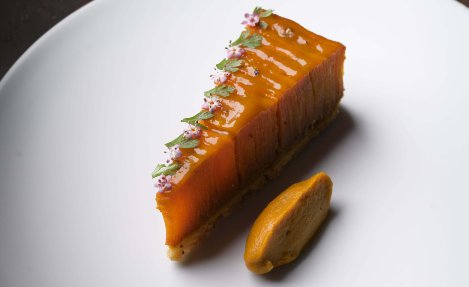 Sablé croustillant, carottes confites en spirale, mousseline onctueuse et vinaigrette aux fanes : un plat signature à la fois technique, esthétique et engagé dans une démarche durable.