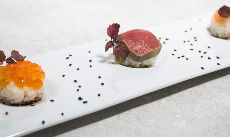 Temari sushi au boeuf, aux oeufs de poisson et au saumon