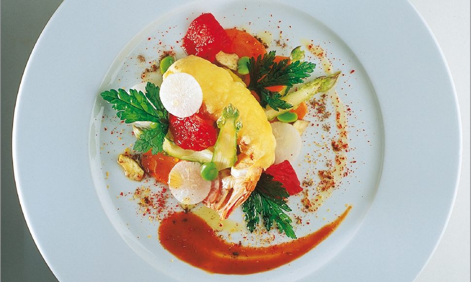 Tempura de grosse langoustine, écrasé de pommes de terre, légumes crus, jus de crevette émulsionné à l’huile d’olive